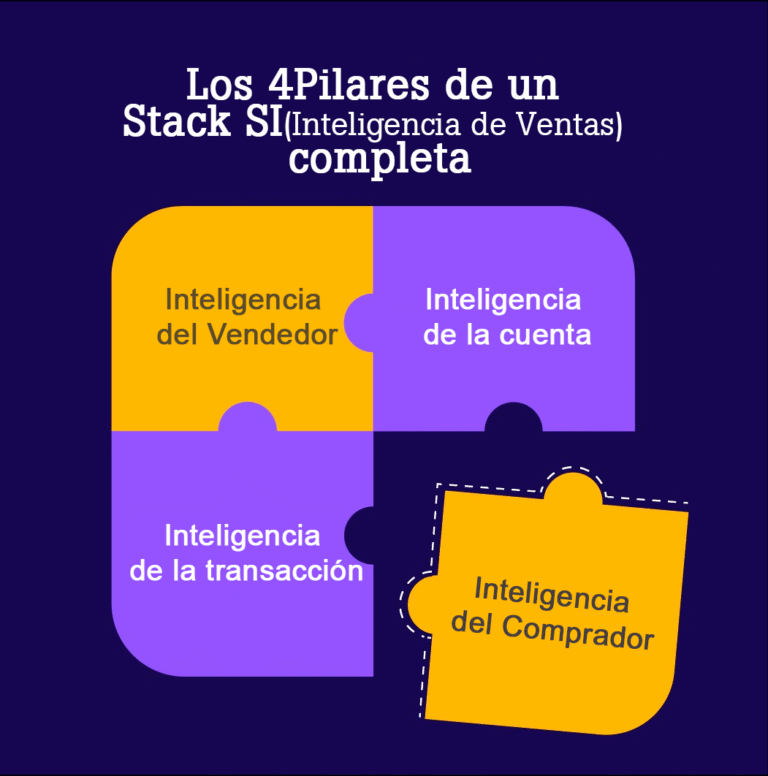 Una estrategia de Inteligencia de Ventas (Intelligence Sales) verdaderamente eficaz no se basa en una sola herramienta. Una forma eficaz de conceptualizar una estrategia de IS completa es analizar los cuatro actores clave en cualquier estrategia: el vendedor, la cuenta, el acuerdo y el comprador. Una debilidad en cualquiera de estas áreas deja a su equipo con un punto ciego.